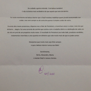 A nossa eterna gratidão pela Depil ter se disposto a fazer parte da nossa Corrente do Bem, por ter abraçado a nossa causa com tanto carinho, por ter envolvido toda a sua equipe (recepcionistas, depiladoras e apoio), e mais, por ter envolvido os seus clientes em prol das nossas crianças.